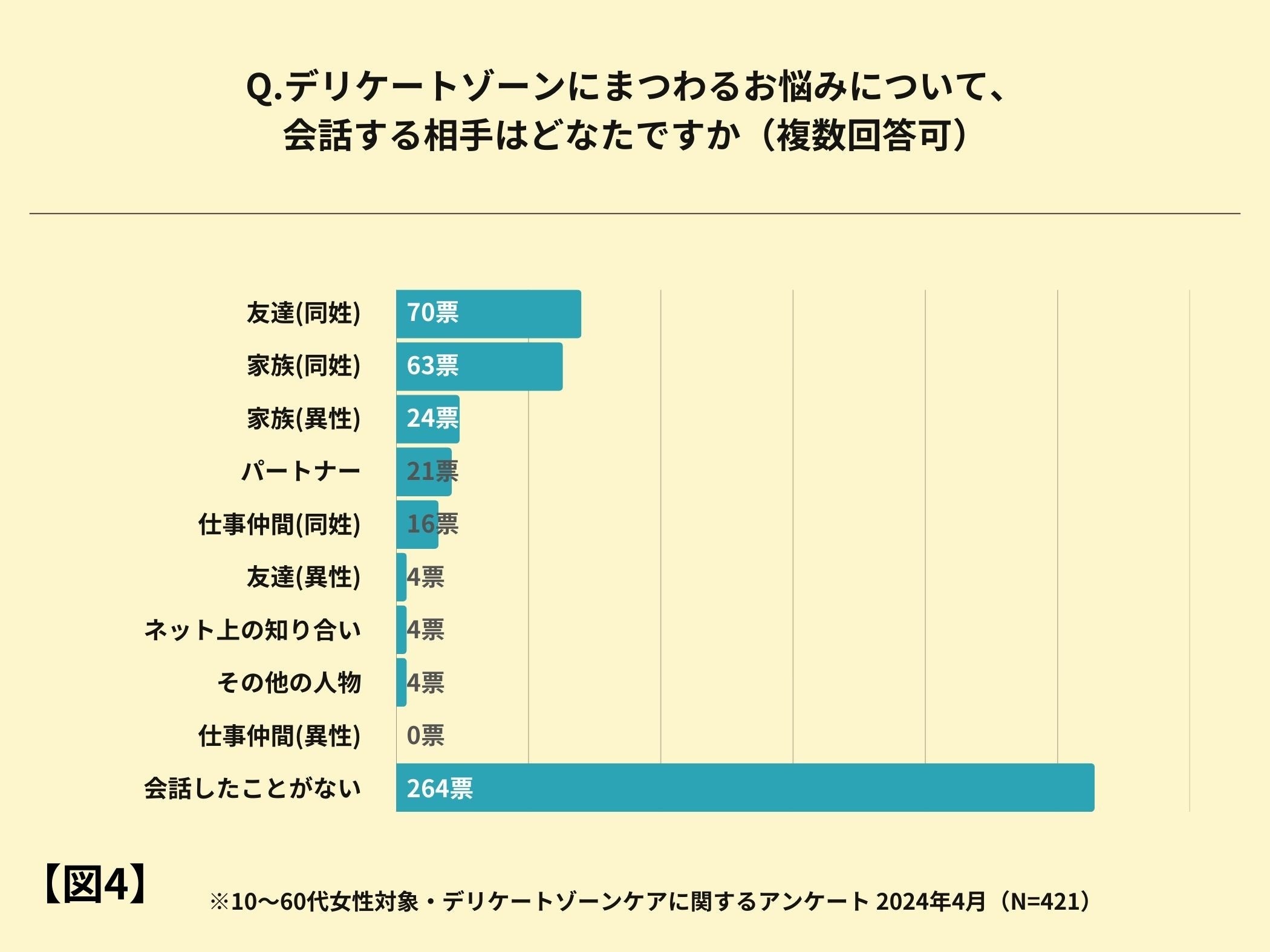 「デリケートゾーンケアにまつわるお悩みについて、周囲と会話する/たまにする」と答えた人はわずか14.5%[図3]。会話する相手についてたずねると、「友達(同姓)(70票)」「家族(同姓)(63票)」が最も多く、親しい間柄の同姓が相手であれば会話するという方が多いようです[図4]。