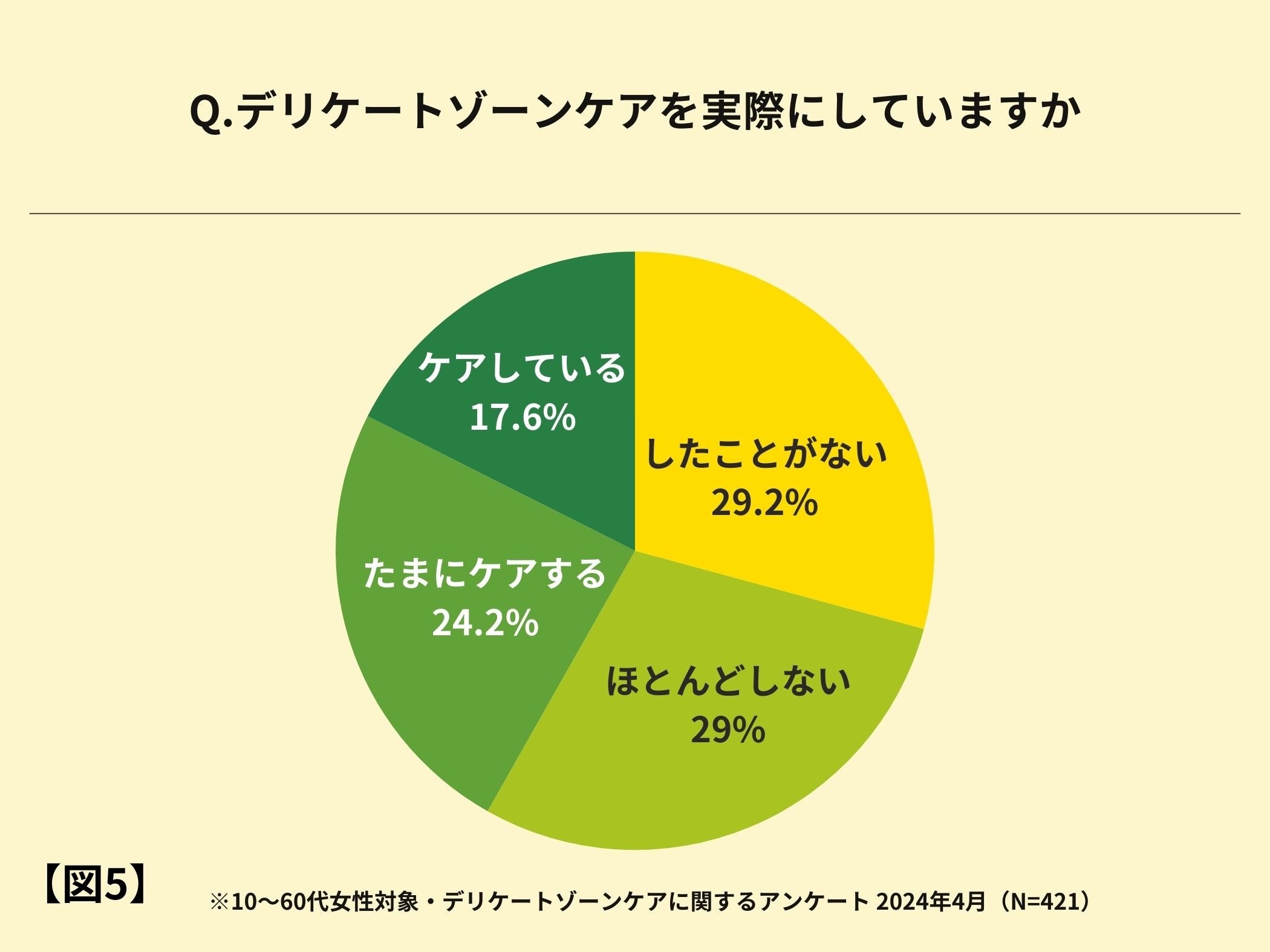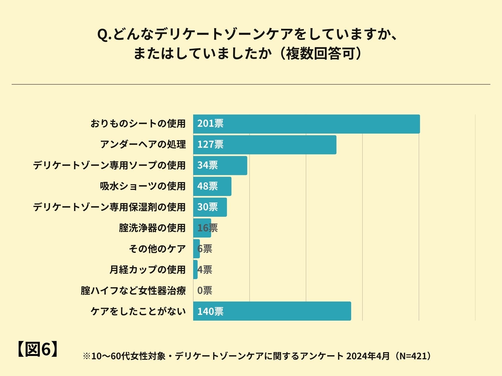 デリケートゾーンケアを実際にしているかたずねると、「ケアしている/たまにケアする」と答えた人が約4割[図5]。どのようなケアをしているか聞いたところ、「おりものシートの使用(201票)」が最も多く、次いで
