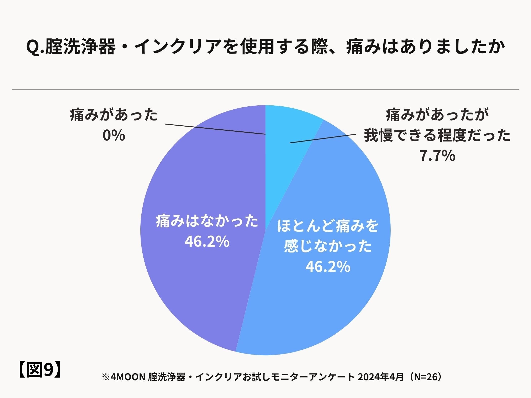 次いで、腟洗浄器・インクリア使用時の痛みについてたずねたところ「痛みがあった」と答えた人は0で、「ほとんど痛みを感じなかった/痛みはなかった」と答えた人が合わせて92.4%を占めました。