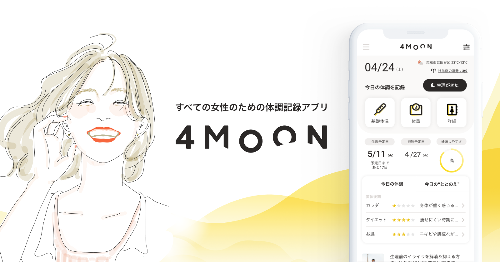 生理から妊活、妊娠、閉経後まで、体調管理ができるヘルスケアアプリです。生理管理だけでなく、ダイエット、妊活、食事記録、スケジュール管理、ニュース、体調記録分析、日記、ヨガコンテンツなど女性のニーズを1つのアプリにまとめました。ライフステージで変わる体調記録のニーズを幅広くサポートしており、利用者が記録や管理したい項目を自分仕様にカスタマイズして、無理なく、タップ1つで、生理日や体重、お通じ、気分、症状など体調を記録し続けることができるのが最大の特徴です。「月」と「体のリズム」を表現した、使い心地の良いシンプルデザインにこだわりました。